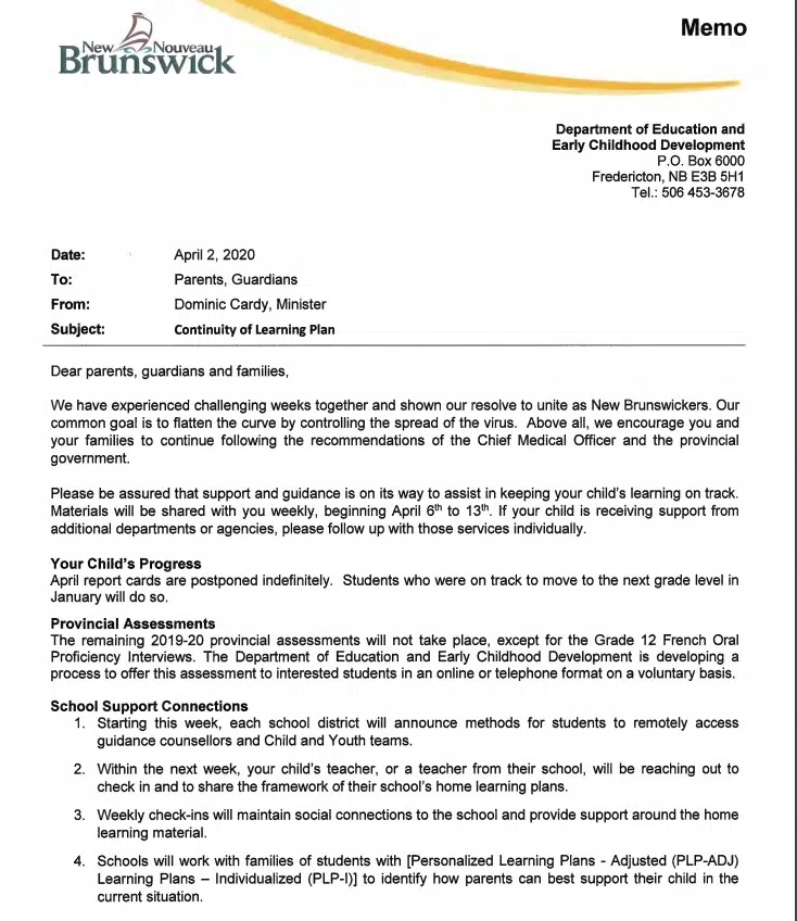Education and Early Childhood Development Minister Dominic Cardy says unless things change drastically, schools across the province of New Brunswick will remain closed for the remainder of the 2019-2020 school year.