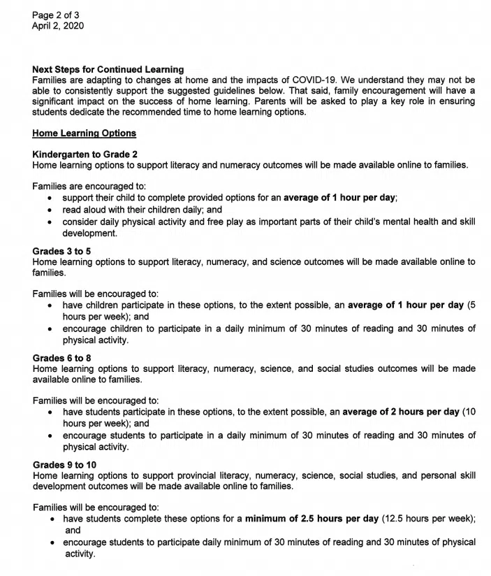 Cardy says, “In addition to completing suggested home learning options, students and families are encouraged to read for a minimum of 30 minutes daily and to engage in 30 minutes of physical acclivity to promote physical health and mental well-being.”