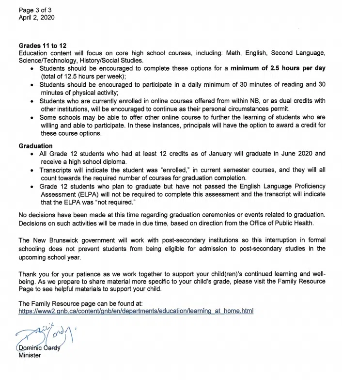 He add, decisions on graduation ceremonies and other graduation events will be made in the coming weeks, based on direction from the Office of the Chief Medical Officer of Health.