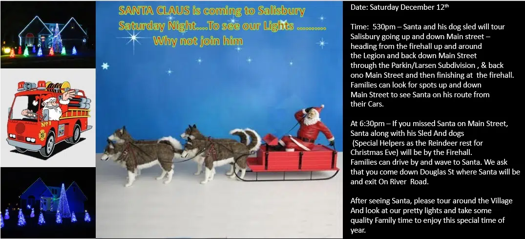 If you miss Santa on Main Street, he’ll be with his Sled and dogs by the Firehall at 6:30pm. Families are invited to drive by and wave to Santa. They ask that you come down Douglas St and exit on River Road.