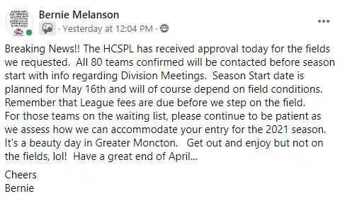 President Bernie Melanson says they are entering their second season, “Last year, we didn’t start until July 5th, because of the pandemic, so it was a late start. We typically start in late May. Our league committee worked together to make it all happen. We had 68 teams, and once we got going, we got really lucky. The weather was great and we didn’t have a lot of cases in Moncton last summer. We only went into orange at the end of the season, so the last two weeks, we got shut down.”
